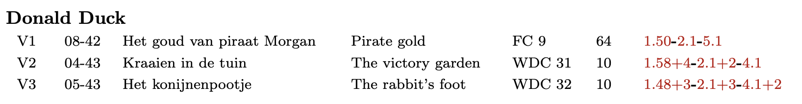 Als het stripboek meerdere stripverhalen bevat dan wordt het V-nummer van het eerste stripverhaal voor de titel van het stripboek geplaatst en de overige stripverhalen tussen haakjes achter de titel van het stripboek :