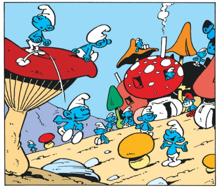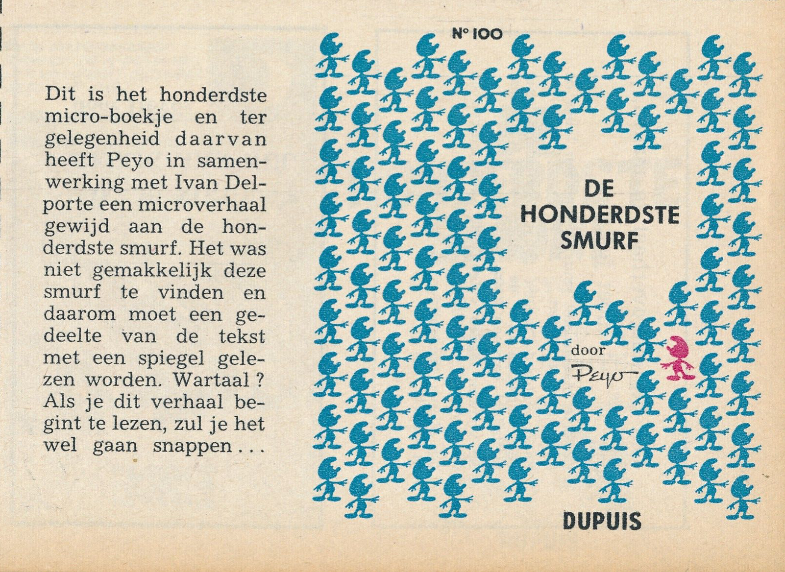 V6 De honderdste smurfHet smurfverhaal V6a De honderdste smurf verscheen voor het eerst in februari 1962 in het Franse smurfblad Spirou 1244 en in het Vlaams/Nederlands stripblad Robbedoes 1244. De hersmurfte versie van het smurfverhaal is gepubliceerd in het stripboek Het ei en de Smurfen in 1968. Ook hier is het eerste plaatje helemaal hersmurft.