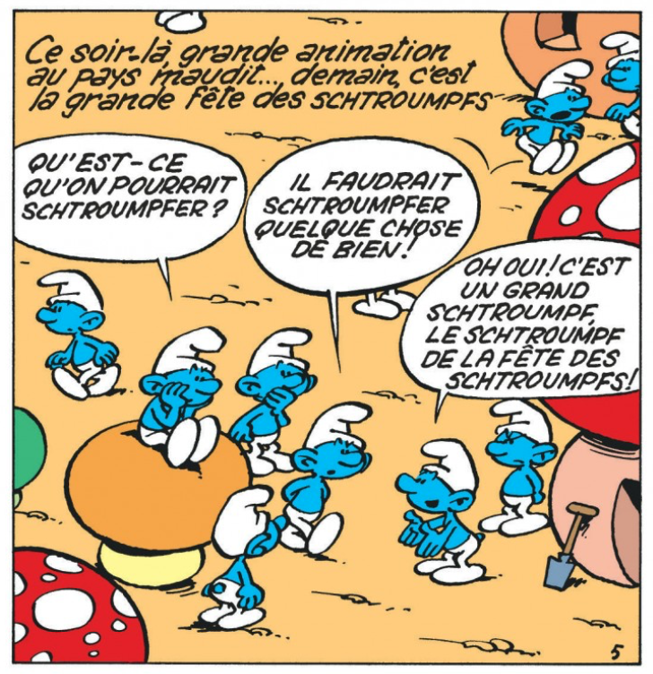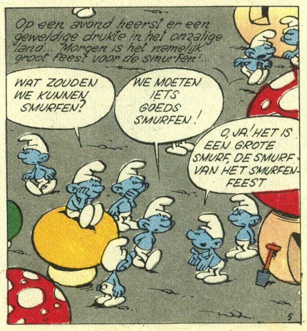 V5 Honger bij de smurfenHet smurfverhaal V5a Honger bij de smurfen verscheen voor het eerst in december 1961 in het Franse smurfblad Spirou 1235. Volgens ons is dit smurfverhaal nooit in het Nederlands in originele versie verschenen. De hersmurfte versie is in december 1966 verschenen in Spirou en Robbedoes nr. 1496 t/m 1500 alvorens in het stripboek De Smurfin in 1967 gepubliceerd te worden.