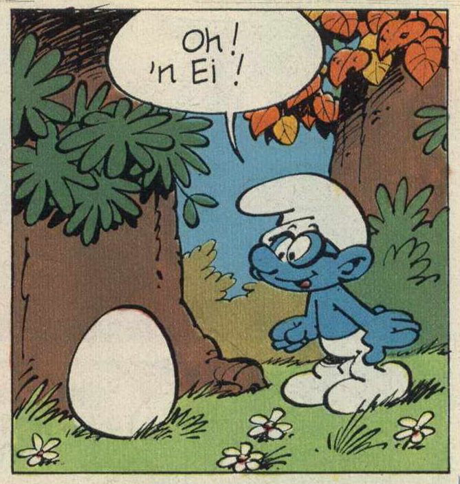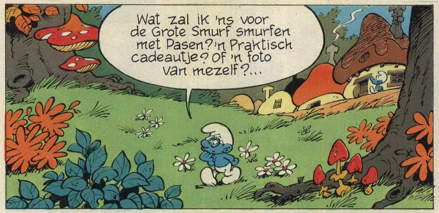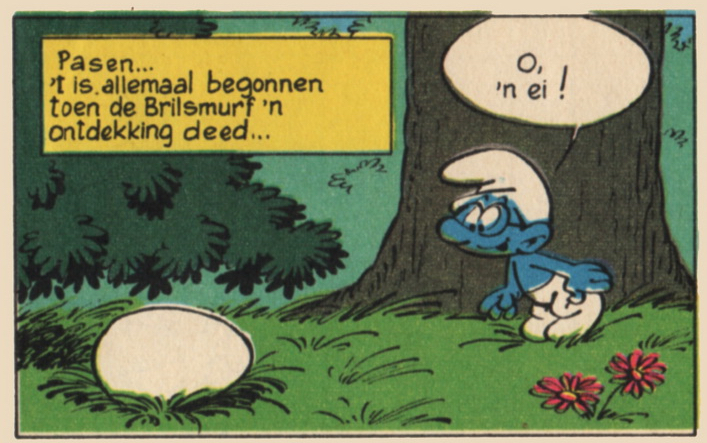 V11 Paassmurf-verhaalHet smurfverhaal V11a Paassmurf-verhaal verscheen voor het eerst in april 1968 in het Franse smurfblad Spirou 1565 en in het Vlaams/Nederlands stripblad Robbedoes 1565. Dit smurfverhaal is erg verwarrend. In Spirou heeft dit smurfverhaal een lengte van 3 pagina's maar in de Robbedoes heeft dit smurfverhaal een lengte van 2 1/2 pagina's. In Robbedoes nr. 1983 uit april 1976 is het smurfverhaal opnieuw gepubliceerd met een lengte van 3 pagina's. Hieruit blijkt dat er in de eerdere versie eenvoudig vier plaatjes weggelaten zijn. In 1981 verscheen een nieuw Paas-smurfverhaal in Robbedoes nr. 2245 dat zeker een hersmurfing van dit smurfverhaal genoemd mag worden. Dit hersmurfte smurfverhaal heeft een lengte van 4 pagina's. Het eerste plaatje uit het originele smurfverhaal is het tweede plaatje van het hersmurfte smurfverhaal.