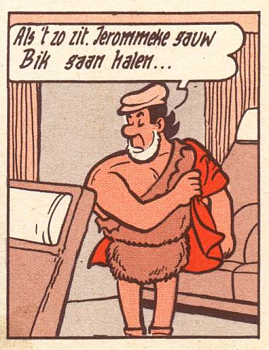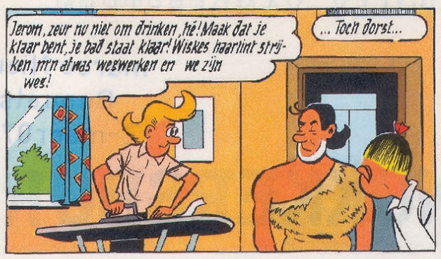 In deze hertekening loopt Jerom nog in zijn dierenhuid en niet in normale kleren. Ook in de vierkleurendruk heeft Jerom nog zijn dierenhuid aan (weliswaar met een hemd er over). Zelfs verderop in het stripverhaal loopt Jerom in de sneeuw in zijn dierenhuid