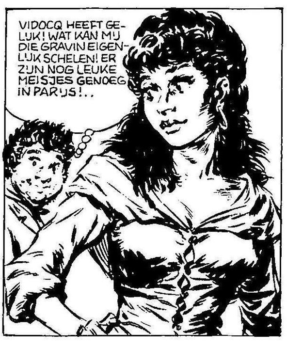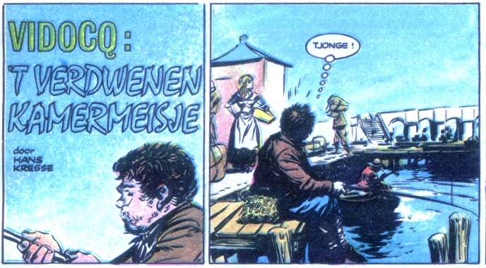 V15 't Verdwenen kamermeisjeHet stripverhaal V15 't Verdwenen kamermeisje verscheen voor het eerst in Pep 1966-34. Voor het stripboek De avonturen van Vidocq uitgegeven door Oberon in 1977 is dit verhaal enigzins aangepast. De belangrijkste veranderingen gebeuren op de eerste pagina. In het hertekende verhaal zijn plaatjes toegevoegd, weggelaten en er is een plaatje uitgebreid. Gelijk het eerste plaatje wordt weggelaten.
