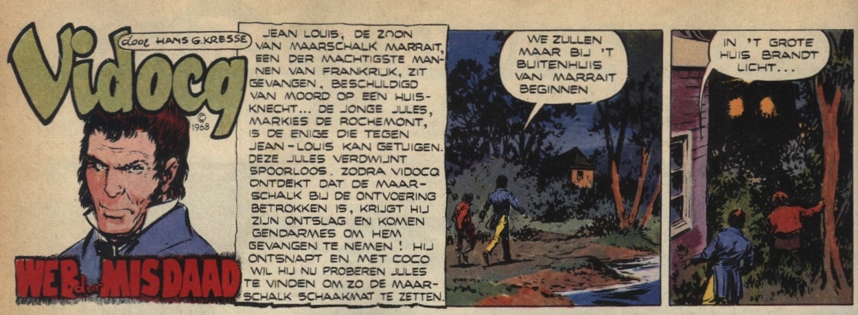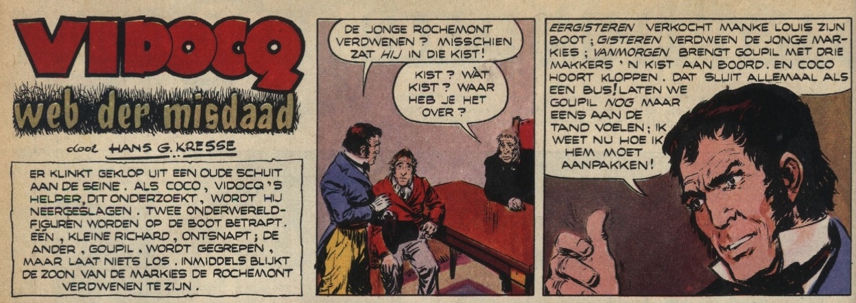 Hertekende stripverhalen van VidocqEnkele stripverhalen van Vidocq zijn door Kresse hertekend of aangepast. Dit zijn:V1 De ontsnappingHet stripverhaal V1 De ontsnapping verscheen voor het eerst in Pep 1965-48. Het heeft een lengte van 5 pagina's. Voor het stripboek De avonturen van Vidocq uitgegeven door Oberon in 1977 is dit verhaal fix aangepast. De eerste twee en een halve pagina van het originele verhaal zijn niet gebruikt en vervangen door 5 en een halve nieuwe pagina's. Zo is de lengte van het nieuwe verhaal 8 pagina's geworden.